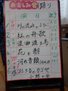 2025年 お楽しみ会♪ 2025.12.29 スタッフのつぶやき, レクリエーション 10月23日、『お楽しみ会』を開催しました! 「小蝶の会」の皆様👘✨ 素敵な着物姿にみなさんうっとり😍 素敵な踊りに圧倒されました🌟 河内音頭は、職員も加わり大盛り上がりでした😊👍 小蝶の会の皆様ありがとうございました💕 スタッフのつぶやき, レクリエーション 頭の体操クラブ(9月)とミニレクリエーション前の記事