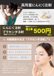 - プラセンタ(ラエンネック)注射:1本500円(更年期症状・肩こり・美肌に)